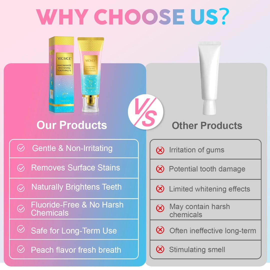 Dentifrice blanchissant à la niacinamide Ce dentifrice blanchissant, enrichi en niacinamide, aide à éliminer efficacement les taches et la plaque tout en procurant une haleine fraîche. Conçu pour une utilisation quotidienne à domicile, il renforce l’émail et favorise la santé des gencives. Sa combinaison d’ingrédients actifs offre un puissant effet blanchissant, tandis que sa saveur mentholée assure une expérience agréable et rafraîchissante lors de vos soins bucco-dentaires quotidiens.